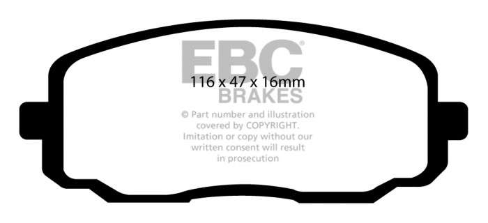 Czarne klocki EBC wykonane są z najwyższej jakości materiałów ciernych, spełniających wymogi norm bezpieczeństwa hamulców ECE R90 i jako takie stanowią doskonały zamiennik klocków montowanych fabrycznie – a przy tym za znacznie mniejsze pieniądze. Produkowane z podkładkami antywibracyjnymi, ukośnymi ścięciami, szczeliną dylatacyjną oraz unikalną powłoką BRAKE-IN, zapewniają niezwykle krótki czas docierania (w Europie tylko określone warianty mają podkładki).