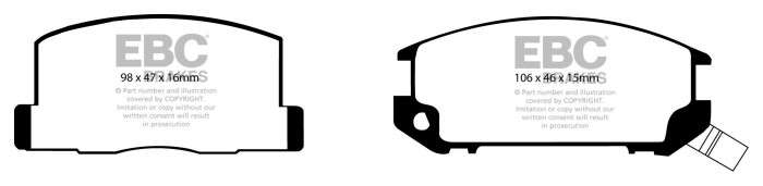 Nie pozwól, aby niższa cena zamiennika przesłoniła Ci ten doskonałej jakości produkt, który zatrzyma Twój samochód równie sprawnie, jak klocki oryginalne, a przy tym szybciej niż większość innych dostępnych na rynku. Wspaniałą zaletą klocków EBC jest ich zdolność do całkowitej eliminacji szarpania przy hamowaniu – po 450-600 km przebiegu praktycznie KOMPENSUJĄ szarpnięcia o umiarkowanym natężeniu. Nominalny współczynnik tarcia 0,46, przy minimalnym ścieraniu tarcz hamulcowych oraz pyleniu na poziomie części oryginalnych.