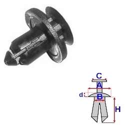 Spinka: RXC10077Kołek rozporowy:Wymiary: A 18/ B 7,9/ C 14/ d 2,6/ H 10, w śr.otworu 8Zastosowanie:Marka Model Zastosowanie Lexus ES300/330 01-06 osprzęt w kom. silnika Lexus ES300/330 96-01 zderzaki nakładka przednia Lexus IS200/300 99-05 zderzaki nakładka tylna Toyota 4 Runner 02-09 zderzaki nakładka tylna Toyota Aygo '05- atrapa krata wlotu powietrza Toyota Celica '99-05 listwy progowe zewnętrzne Toyota Corolla '97-'01 listwy progowe zewnętrzne Toyota Previa '90-'99 zderzaki nakładka przednia górne mocowanie Toyota RAV4 '00-'05 bagażnik osprzęt piątych drzwi przy kole zapasowym Toyota Starlet '96-'99 zderzaki nakładka przednia górne mocowanie Toyota Yaris '99-'05 zderzaki nakładka przednia mocowanie górne Toyota Yaris Verso zderzaki nakładki przód i tył, krata wlotu powietrza, poszerzenia błotników przód tył