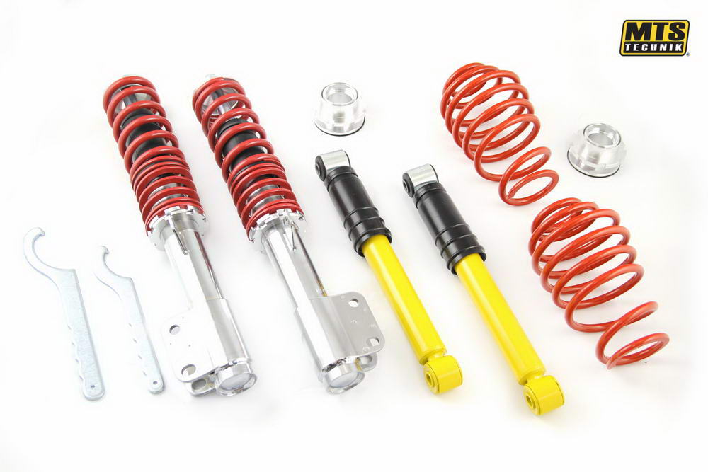 Przednia i tylna oś z regulacją wysokości (nagwintowane kolumny amortyzatorów przednich, na osi tylnej regulacja wysokości na sprężynach + amortyzatory).